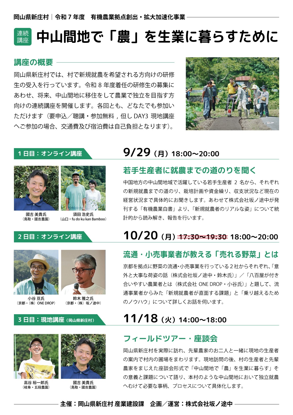 岡山県新庄村では、村で新規就農を希望される方向けの研修生の受入を行っています。令和8年度着任の研修生の募集にあわせ、将来、中山間地に移住をして農業で独立を目指す方向けの連続講座を開催します。各回とも、どなたでも参加いただけます(要申込/聴講・参加無料,但し DAY3現地講座へご参加の場合、交通費及び宿泊費は自己負担となります)。
