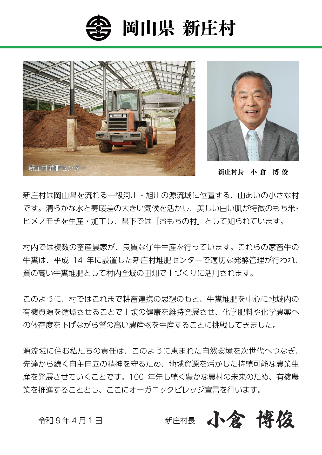 新庄村は、令和8年4月1日に有機農業の推進に向けて「新庄村有機農業実施計画」を策定し、「オーガニックビレッジ宣言」を行いました。